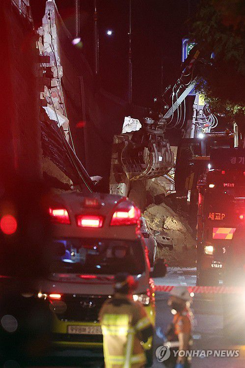 (오산=연합뉴스) 권준우 기자 = 16일 오후 경기 오산시 가장동 가장교차로 고가도로의 10m 높이 옹벽이 도로로 무너지며 고가도로 아래 도로를 지나가던 차량을 덮치는 사고가 났다.