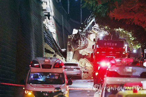 (오산=연합뉴스) 권준우 기자 = 16일 오후 경기 오산시 가장동 가장교차로 고가도로의 10m 높이 옹벽이 도로로 무너지며 고가도로 아래 도로를 지나가던 차량을 덮치는 사고가 났다.