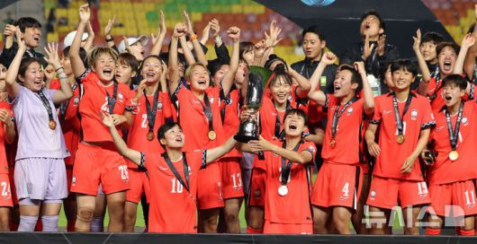 [수원=뉴시스] 김선웅 기자 = 16일 경기 수원시 수원월드컵경기장에서 열린 2025 동아시아축구연맹(EAFF) E-1 챔피언십(동아시안컵) 여자부 시상식에서 우승국 대한민국 여자 축구대표팀 선수들이 트로피를 들고 기뻐하고 있다. 2025.07.16. mangusta@newsis.com