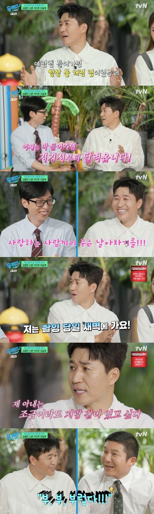 또 김종민은 조세호가 현관을 더 사랑하는 것 같다고 폭로했고, 조세호는 “친구들 만난다니까 '와이프가 허락해 줘?' 하더니 '집에 있는 걸 좋아해서 내가 나가는 걸 좋아한다'고 하니까 '부럽다'고 했다”라고 맞폭로를 해 웃음을 자아냈다.