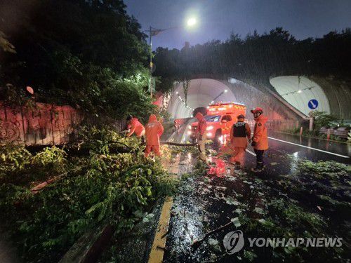 (인천=연합뉴스) 16일 오후 인천시 부평구 산곡동 도로에 나무가 쓰러져 소방 당국이 안전 조치하고 있다. 2025.7.16 [인천소방본부 제공. 재판매 및 DB 금지] goodluck@yna.co.kr