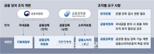 금융위는 이런 상황에 곤혹스러워 하는 분위기다. 조직개편의 직접 당사자로 거론되는 상황이고, 비정부기관인 한은·금감원에 비해 발언 자유도가 높지 않아 ‘속앓이’만 하는 모습이다.