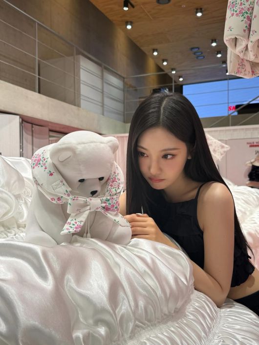 마지막 컷에서 닝닝은 거대한 핑크 곰인형을 꼭 껴안으며 따뜻한 포즈를 연출한다. 블랙 니삭스와 블랙 하이힐의 조합은 다리를 더욱 길어보이게 만들었고, 길게 뻗은 각선미와 작은 얼굴이 어우러지며 만화 속 주인공 같은 비현실적인 비율을 완성했다.