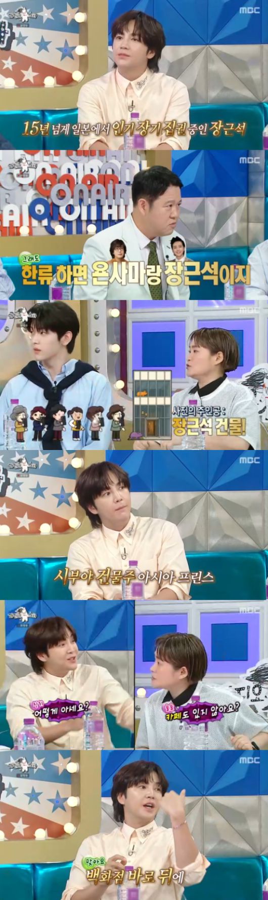 이에 장근석은 "맞다. 그걸 어떻게 그렇게 잘 아시냐. 백화점 바로 뒤 건물"이라고 웃었고, 김구라는 "근석이가 한창 엔화가 좋을 때 활동을 하지 않았냐"고 말해 웃음을 자아냈다.