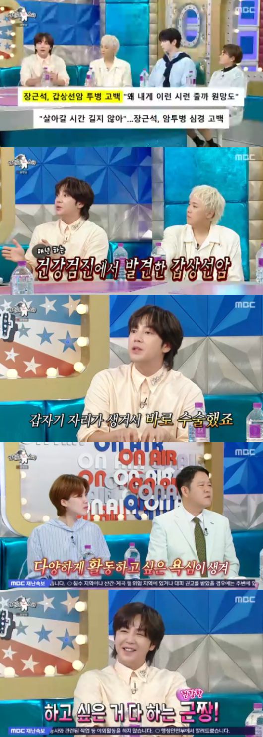 김국진은 "'라스'에 출연을 결심한 이유가 뭐냐"고 물었고, 장근석은 "작년에 갑상선암으로 투병을 했다. 아주 작은 크기일 때 빨리 발견을 했다. 그런데 그 때 의료 대란이 일어났을 때였다. 그래서 10개월동안 수술을 못했다. 그러다 갑자기 수술이 잡혀서 바로 수술을 했다"고 말했다.