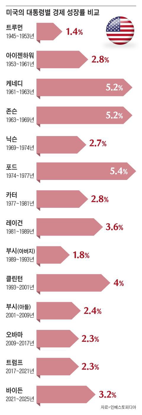 미국을 보자. 미국의 대통령 성장률은 우리와 달리 들쑥날쑥하다. 카터 때 2.8%로 주춤했던 성장률을 규제 완화와 감세를 내세운 ‘레이거노믹스’로 3.8%까지 올린 레이건이 있는가 하면, 재정 흑자 시대를 열며 평균 4% 성장을 달성한 클린턴 대통령이 있다.