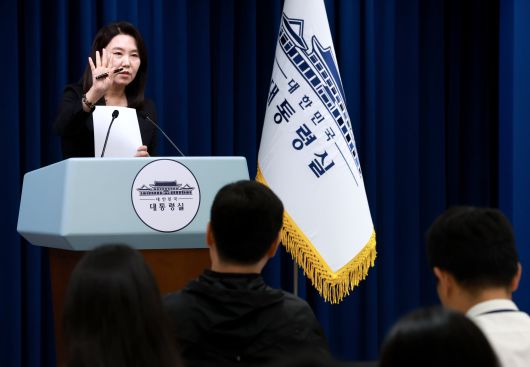 강유정 대통령실 대변인이 16일 서울 용산 대통령실 청사에서 현안 브리핑을 마친 뒤 취재진 발언에 답하고 있다./연합뉴스 |