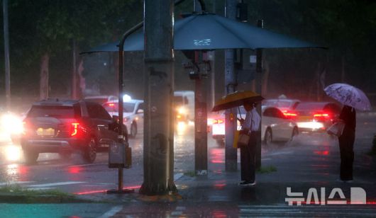 [서울=뉴시스] 최진석 기자 = 서울 전역에 호우주의보가 발효된 16일 서울 노원구 상계동 거리에서 시민들이 내리는 비를 맞으며 횡단보도 신호를 기다리고 있다. 2025.07.16. myjs@newsis.com |