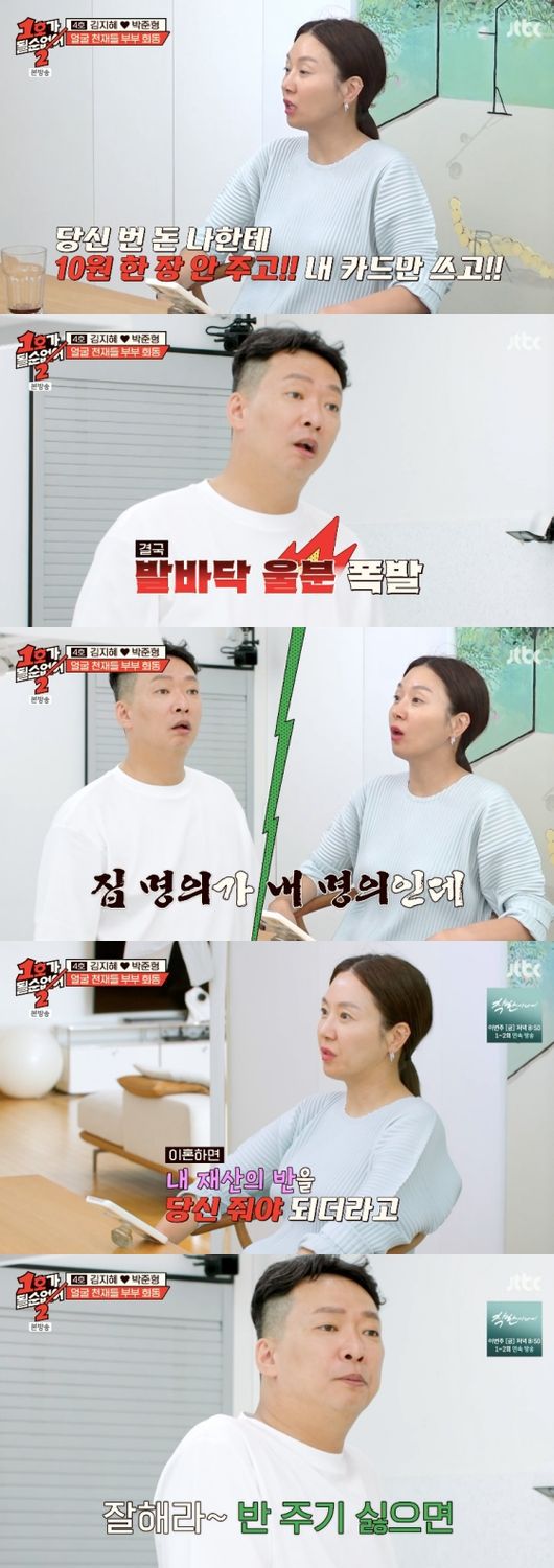 김지혜는 박준형이 자신의 카드로 돈을 막 쓰는 것에 불만을 드러내며 “당신 번 것도 나한테 10원 한 장 안 주고 내 것만 쓴다. 당신이 생활비 준 게 1년이 안 됐다”라고 말했고, 박준형은 “이 집을 혼자 샀냐”라고 반격했다. 김지혜는 “명의가 내 명의인데 혼자 샀지. 그렇게 따지면 20년 동안 매해 얼마 벌었는지 나오는데 목록을 뽑아볼 것이냐. 구분해 줄까”라고 팽팽하게 대립했다. 박준형은 갑작스럽게 눈빛이 흔들리는 모습으로 웃음을 자아냈다.