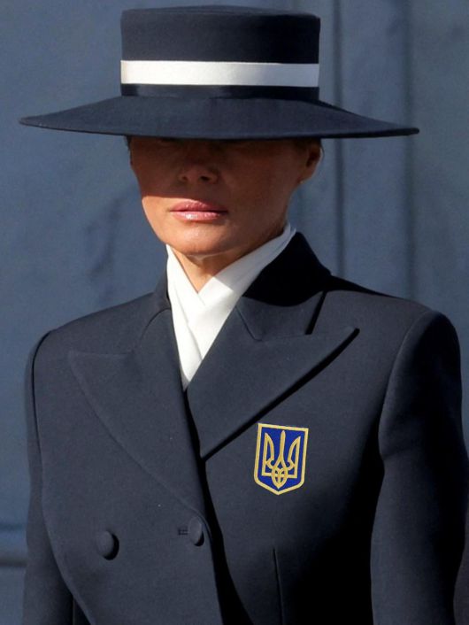 도널드 트럼프 미국 대통령의 부인 멜라니아 여사의 상의에 우크라이나를 상징하는 ‘삼지창’이 새겨진 합성 사진. 사진 출처 ‘X’ |