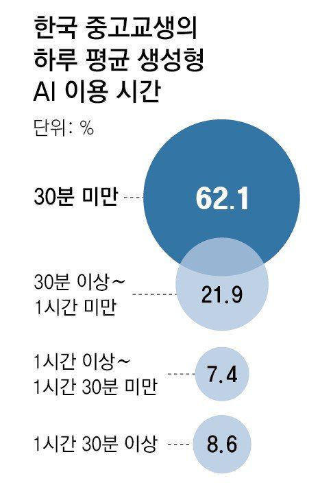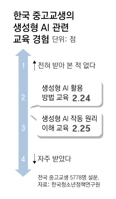 우리나라는 2022 개정 교과 과정을 통해 초·중등 정보 과목 시수를 기존 대비 2배가량 높였다. 하지만 여전히 수업 시간이 주요국 대비 턱없이 모자란다. 초등학교의 경우 6년 전체 수업 시간 5892시간 중 정보교육은 34시간(0.58%)에 그친다. 이마저도 독립된 정보 교과가 아니라 실과 시간에 배우는 형편이다. 중학교에서는 정보 교과가 따로 있지만 3년간 68시간으로 전체 중학교 수업 시수의 2%에 불과하다. 고등학교의 경우 선택 과목이어서 상당수 학교에서는 3년 내내 AI와 관련한 수업을 접하지 못할 수 있다. 반면 영국(374시간), 일본(405시간), 중국 베이징(212시간) 등은 한국보다 정보 관련 수업이 많은 편이다. 부족한 교육시간을 반영하듯 한국 청소년정책연구원이 청소년들의 AI 교육 경험을 4점 척도(전혀 받아본 적 없다 1점∼자주 받았다 4점)로 측정한 결과 2점대의 낮은 점수가 나왔다.