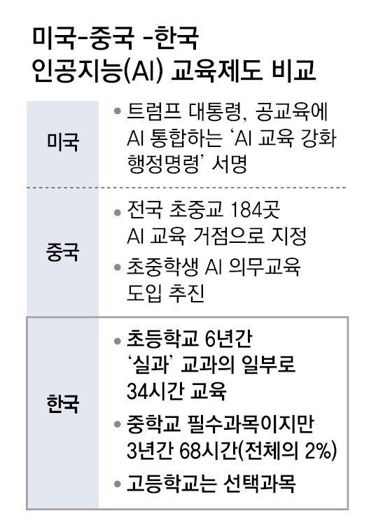 반면 AI 패권 경쟁을 벌이고 있는 미국은 AI 교육 확대에 강한 드라이브를 걸고 있다. 도널드 트럼프 대통령은 올 4월 미국 초중고 공립학교의 정규 교육 과정에 AI를 통합한다는 ‘AI 교육 강화를 위한 행정명령’에 서명했다. 유치원부터 고등학교(K-12)까지 체계적으로 AI를 교육하기 위해서다. 중국 교육부는 전국 초중학교 184곳을 AI 교육 거점으로 지정한 데 이어 지난해 중국 최대 연례 정치 행사인 양회에서 초·중학생을 위한 AI 의무교육 도입을 추진하기로 했다.