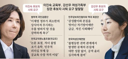 친여 성향의 시민단체에서는 이날도 두 후보자를 향한 사퇴 요구가 이어졌다. 참여연대는 입장문에서 두 후보자에 대해 “장관으로서의 중대한 결격사유가 확인돼 국민 눈높이에 미달하는 만큼 스스로 사퇴하는 것이 마땅하다”고 밝혔다. 이 후보자에 대해서는 “제자 논문 표절 의혹에 따른 연구윤리 위반과 자녀 조기 유학에서 초중등교육법 위반은 교육부 수장으로서 치명적인 결격사유”라고 했고, 강 후보자에 대해서는 “국회의원이라는 우월적 지위를 이용해 공적 권한을 사적으로 남용한 것으로 중대한 결격사유”라고 했다.