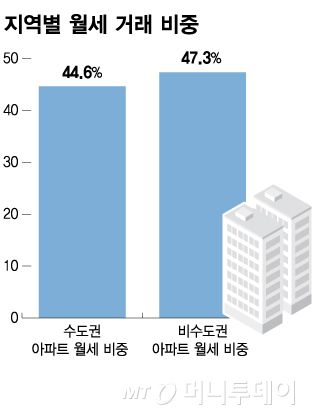 아파트 월세 거래 비중은 45.6%를 기록하며 조사가 시작된 이래 최고치를 경신했다. 수도권 아파트의 월세 비중은 44.6%, 비수도권은 47.3%로, 각각 최근 5년 평균(수도권 40.4%, 비수도권 39.6%)을 크게 웃돌았다. '국평 아파트'로 불리는 전용면적 84㎡(33평형 내외)의 중형 아파트 역시 월세 거래가 점차 보편화되는 셈이다.