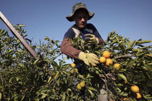 브라질 상파울루주 리메이라의 농장에서 한 농민이 오렌지를 수확하고 있다. AP 뉴시스 |