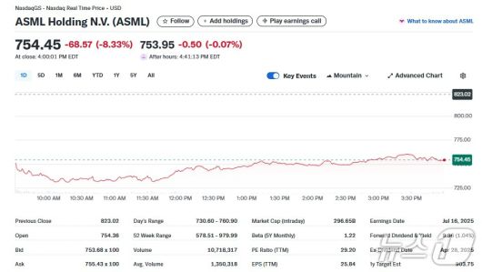 16일(현지시간) 뉴욕증시에서 ASML은 8.33% 급락한 754.45달러를 기록했다.