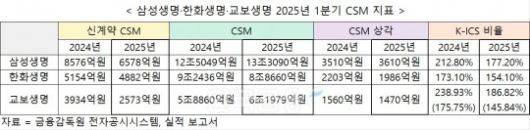 신계약 CSM은 삼성생명이 6578억원, 한화생명이 4882억원, 교보생명이 2573억원을 기록했다. 3사 모두 계리적 가정 변경 영향으로 작년 1분기 대비 감소했다.
