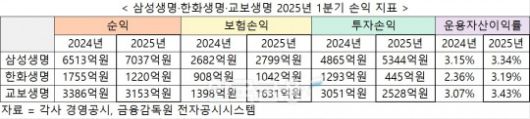 투자손익은 삼성생명이 5344억원으로 3사 중 가장 높았으며 교보생명이 2528억원, 한화생명이 445억원으로 그 뒤를 이었다.
