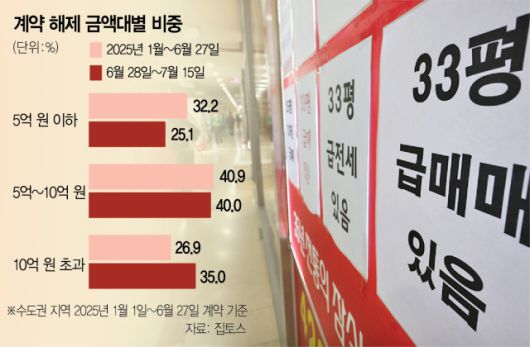 16일 부동산 중개업체 집토스가 올해 들어 6월 27일까지 매매 계약이 이뤄진 수도권 아파트의 해제 계약 현황을 분석한 결과에 따르면 6월 28일부터 이달 15일까지 신고된 해제 계약 중 매매 금액 10억 원 초과 아파트의 비중은 35.0%로 나타났다. 이는 대출 규제 발표 전인 6월 27일까지의 26.9%보다 늘어난 수치다. 반면 취소된 계약 중 5억 원 이하 아파트가 차지하는 비중은 대출 규제 발표 전 32.2%에서 25.1%로 줄었다. 5억 원에서 10억 원 이하 아파트의 비중은 같은 기간 40.9%에서 40.0%로 비슷한 수준이 유지됐다.