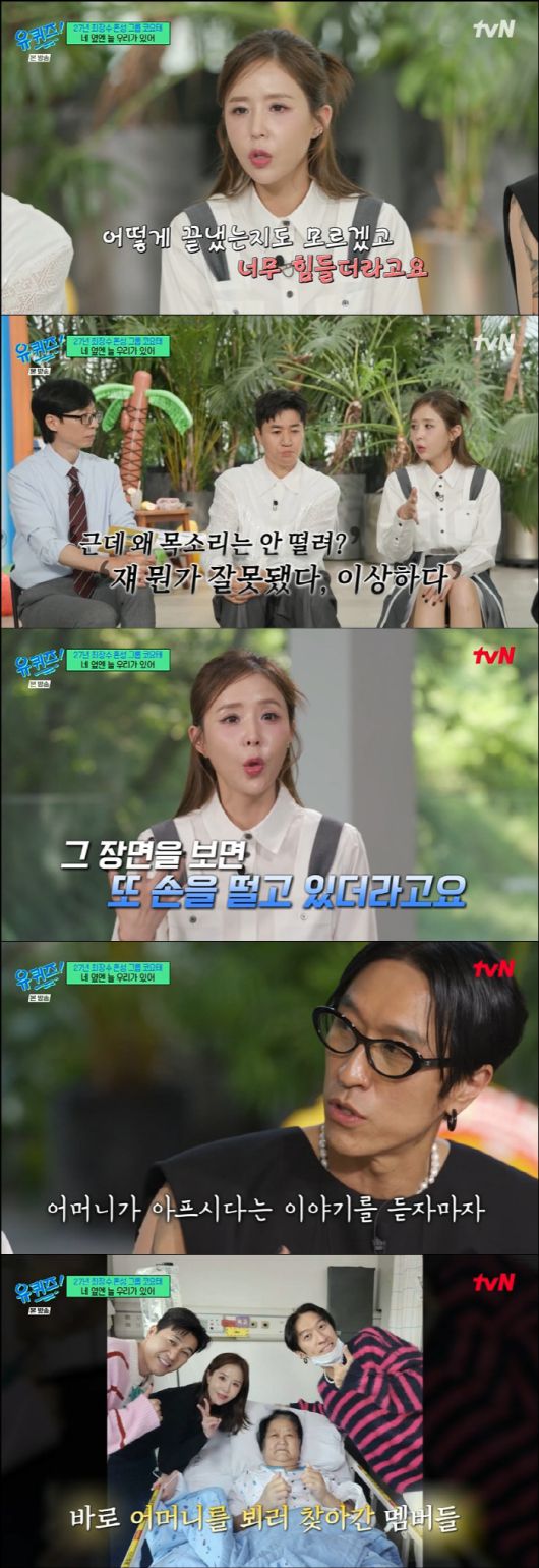 이어 "그때는 생각도 하고 싶지 않다. 너무 힘들었다. 웬만하면 자료 화면으로도 쓰지 말아달라고 부탁한다. 나는 꼭 김종민과 빽가 사이에 있어야 빛이나고 자신감을 얻는다는 걸 다시 한번 느끼게 됐다"며 "갑자기 일을 쉬게 되면서 경제적으로 힘들었는데 김종민이 흔쾌히 도움을 줬다. 힘들어할 때까지 힘들 수 있게 내버려 둬 줬다. 제가 나오고 싶을 때 나오라는 마음으로 지켜봐줬다. 멤버들이 옆에서 도와주고 믿어주고 응원해 줘서 코요태가 쭉 갈 수 있었다"라고 고마워했다.