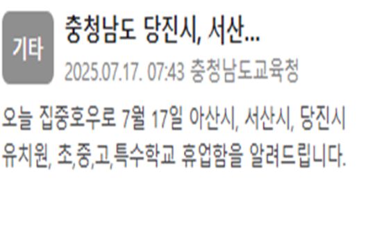 충남교육청은 17일 "오늘 집중호우로 아산시, 서산시, 당진시는 유치원과 초·중·고, 특수학교가 휴업함을 알려드린다"는 내용의 재난문자를 발송했다.