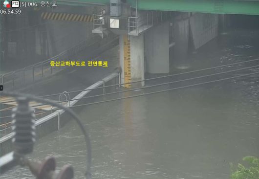 서울교통정보센터 토피스(TOPIS)는 이날 오전 6시 53분부터 증산교 하부 도로 양방향 모두 강우로 통제됐다며 우회하라고 안내했다.