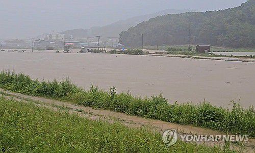(아산=연합뉴스) 폭우가 내린 17일 오전 충남 아산시 배방읍 세교리 천안천이 밤새 쏟아진 비로 불어나 있다. 2025.7.17 [독자 제공. 재판매 및 DB 금지]
