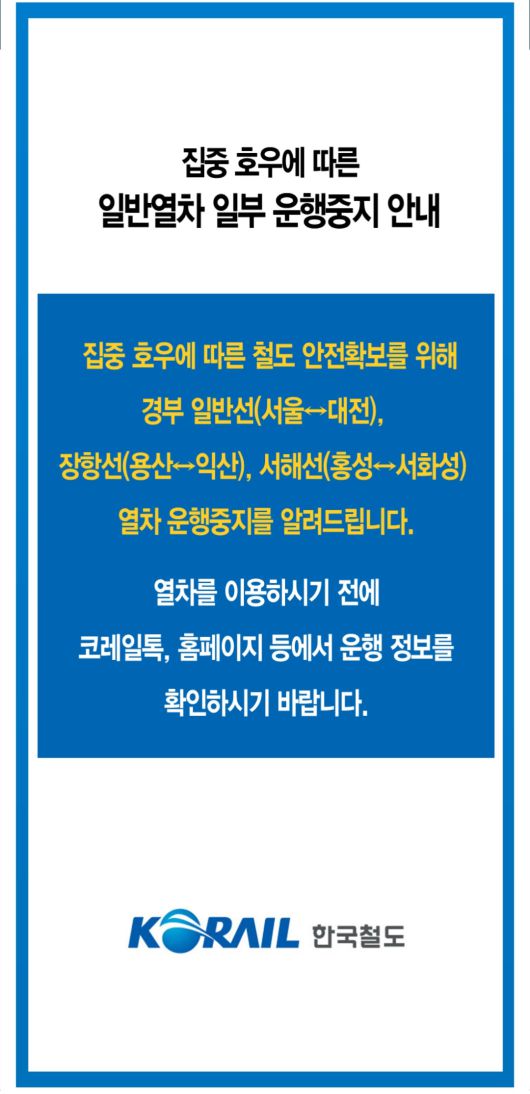 17일 오전 수도권 지하철 1호선 성환역에서 신창역 구간 열차 운행이 전면 중단됐다. 이와 함께 일반열차 경부선 서울~대전, 장항선 천안~익산, 서해선 홍성~안중 구간도 집중호우로 인해 일시 운행이 중지된 상태다. 한국철도공사는 안전재난문자를 통해 이를 안내했다.