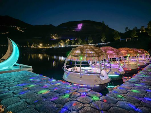 별빛과 조명이 빛나고, 호수 위의 수상레저가 시원한