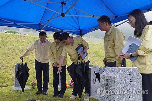 (서울=연합뉴스) 강윤진 신임 국가보훈부 차관이 지난 16일 경북 영천시 국립영천호국원에서 묘역 배수 실태 현장점검을 하고 있다. 2025.7.17 [국가보훈부 제공. 재판매 및 DB 금지]
