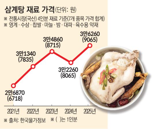17일 전문가격조사기관인 한국물가정보가 복 시즌을 맞아 전통시장에서 삼계탕(4인 기준) 재료 7개 품목의 가격을 조사한 결과, 총 3만6260원으로 1인분에 약 9000원이 들어가는 것으로 조사됐다. 이는 5년 전(26,870원) 대비 34.9%, 작년(32,260원) 대비 12.4% 오른 가격이다.