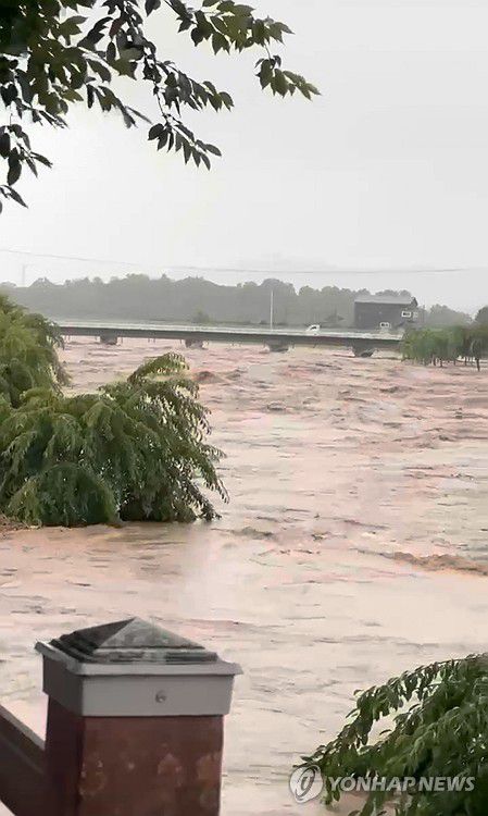 (서산=연합뉴스) 충남 전역에 호우특보가 발효된 가운데 17일 오전 충남 공주 사곡면 유구천이 범람해 있다. 2025.7.17 [독자 제공. 재판매 및 DB 금지]