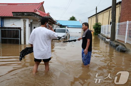 (예산=뉴스1) 김기태 기자 = 밤 사이 쏟아진 집중폭우로 침수 피해가 발생한 17일 충남 예산군 삽교읍 주택가가 침수돼 있다. 2025.7.17/뉴스1presskt@news1.krCopyright ⓒ 뉴스1. All rights reserved. 무단 전재 및 재배포, AI학습 이용 금지.
