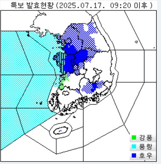 [스타데일리뉴스=서태양기자] 기상청은 17일 오전 9시 10분 발표한 속보에서 현재 중부지방, 전북북서부, 경남에 호우특보가 발효 중이라고 밝혔다.