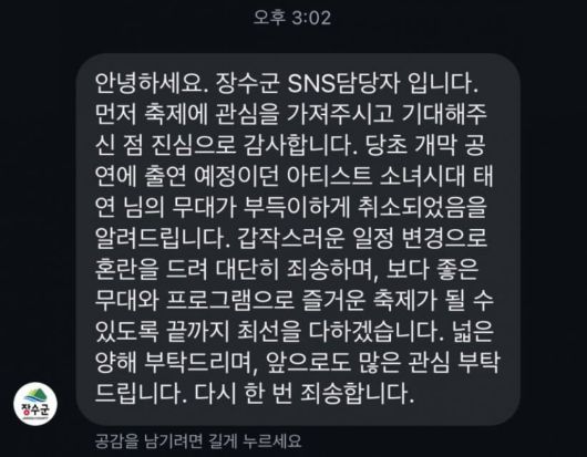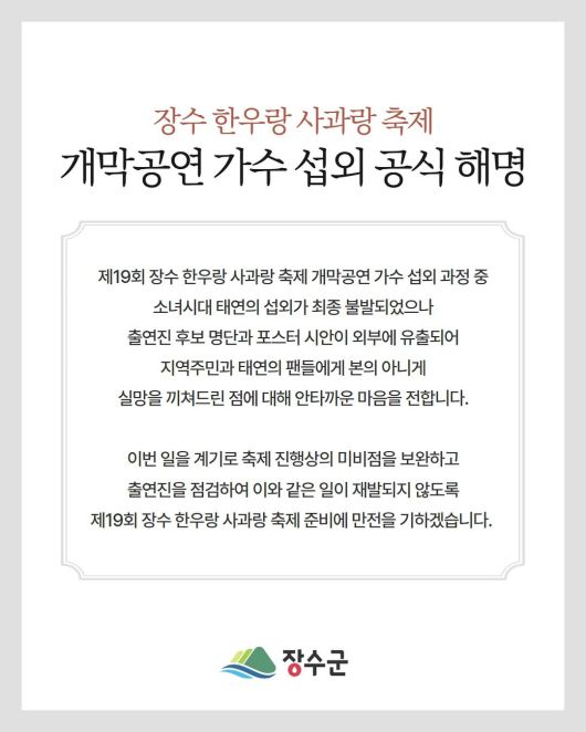 장수군청은 부랴부랴 수습에 나섰다. 이날 첫 공식입장으로 "소시 태연이 출연 예정이었으나, 무대가 부득이하게 취소됐다"고 밝혔다. 섭외했고, 확정했지만, 취소라는 이야기다.