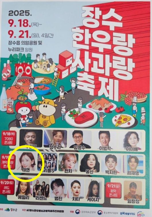 그도 그럴 게, 포스터 속 둘째 날(9월 19일) 라인업에 '소시' 태연의 사진과 이름이 붙어 있었다. 태연의 지역축제 참석은 이례적인 일. 장수군청 관계자도 언론과의 통화에서 "태연이 맞다"고 답변해 화제를 모았다.
