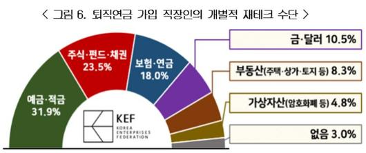 퇴직연금 가입 직장인들이 개인적으로 운용하는 재테크 수단은 예금·적금(31.9%), 주식·펀드·채권(23.5%), 보험·연금(18.0%), 금·달러(10.5%), 부동산(8.3%), 가상자산(4.8%) 순이었다.