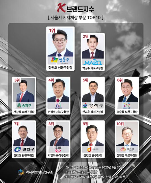 K-브랜드지수 서울시 지자체장 부문은 정원오 성동구청장이 1위에 등극했으며, 박강수 마포구청장(2위), 서강석 송파구청장(3위), 전성수 서초구청장(4위), 진교훈 강서구청장(5위), 오승록 노원구청장(6위), 김경호 광진구청장(7위), 박일하 동작구청장(8위), 김길성 중구청장(9위), 장인홍 구로구청장(10위)이 TOP10에 이름을 올렸다.