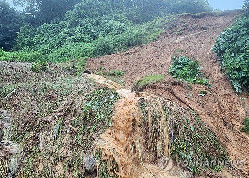 (세종=연합뉴스) 폭우가 쏟아진 17일 오전 세종시 전의면 달전리 한 야산이 무너져 내렸다. 세종에는 이날 오전 1시 12분 '호우경보'가 발효됐다. 2025.7.17 [독자 제공. 재판매 및 DB 금지]