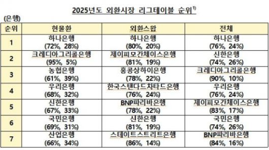 한국은행과 기획재정부는 서울외환시장운영협의회가 발표한 '2025년도 외환시장 리그테이블'에서 하나은행이 1위를 차지했다고 17일 밝혔다.