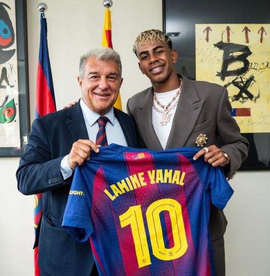 바르셀로나는 17일(한국시간) 공식 홈페이지를 통해 "야말이 다음 시즌 바르셀로나에서 10번을 달게 된다. 2031년까지 재계약에 서명한 날 야말은 10번 유니폼을 받았다. 야말은 41번을 달고 1군에 데뷔했고 27번으로 빛을 발했으며 19번으로 입지를 다졌다. 이제 야말은 10번을 달고 자신을 높일 때다"라고 공식 발표했다.