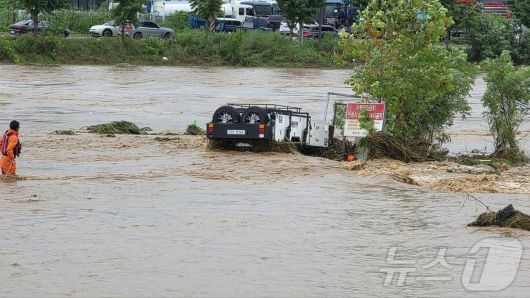 (아산=뉴스1) 이시우 기자 = 밤사이 쏟아진 집중폭우로 침수 피해가 발생한 17일 충남 아산시 배방읍 곡교천변에서 소방대원들이 불어난 빗물에 쓰러진 시설물과 침수차량을 살펴보고 있다. 2025.7.17/뉴스1newskija@news1.krCopyright ⓒ 뉴스1. All rights reserved. 무단 전재 및 재배포, AI학습 이용 금지.