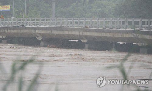 (청주=연합뉴스) 이성민 기자 = 집중호우가 쏟아진 17일 오전 홍수 심각 단계가 발령된 충북 청주시 옥산면 환희교 아래에 물살이 위태롭게 흐르고 있다. 2025.7.17