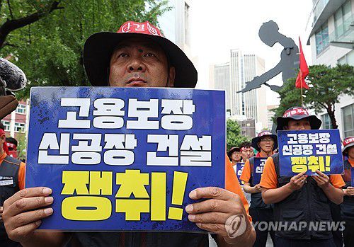 (서울=연합뉴스) 김성민 기자 = 전국금속노동조합 금호타이어지회 조합원들이 17일 서울 종로구 금호타이어 본사 인근에서 항의 상경 집회를 열고 있다. 2025.7.17