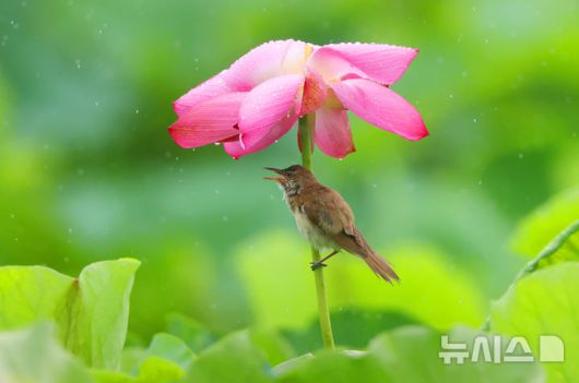 [창원=뉴시스] 여름 철새 개개비가 지난 16일 경남 창원시 의창구 동읍 주남저수지의 연꽃 아래에서 폭우를 피하고 있다.(사진=최종수 경남도 주무관 제공)2023.07.17. photo@newsis.com |