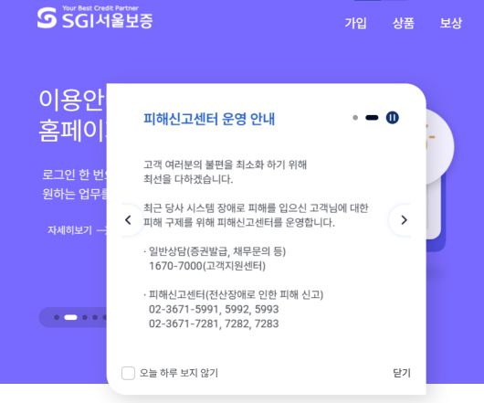 SGI서울보증이 랜섬웨어 피해에 대응해 17일 공식 홈페이지 공지사항을 통해 피해신고센터 운영과 상담 안내를 공지하고 있다. |