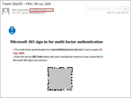 16일 보안 솔루션 ‘알약’을 운영하는 이스트시큐리티에 따르면 ‘Ticket# QQL0ISI - MFA | 09 July,2025’ 제목의 악성 메일이 대량 유포되고 있다. 해당 메일은 수신자의 다중인증이 만료된다며 MS 365 서비스 연결을 위해 QR코드 스캔을 유도하는 수법을 사용한다.