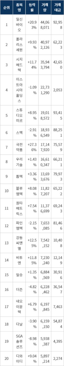 코스닥 거래량 상위 종목들이 전반적으로 엇갈린 흐름을 보이고 있다. 17일 한국거래소에 따르면, 일신바이오(068330)가 4천4백만주 이상 거래되며 코스닥 종목 중 실시간 거래량 1위를 차지했다. 현재 주가는 2,265원이며, 시가총액 대비 거래대금은 약 9.28%로 강한 매수세를 보이고 있다. PER은 25.74, ROE는 6.49로 비교적 안정적인 재무 상태를 유지하고 있다. 폴라리스세원(234100)는 4천만주 이상 거래되며 거래량 2위에 올랐으며, 현재 주가는 1,506원, 거래대금은 6.22%에 해당한다. PER은 14.91, ROE는 4.78로, 시장에서의 수급이 활발하게 이뤄지고 있다.