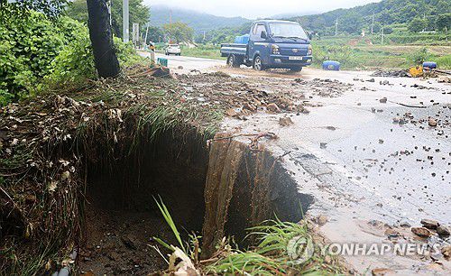 (당진=연합뉴스) 이주형 기자 = 17일 오전 폭우가 쏟아진 충남 당진시 면천면의 한 도로가 유실돼있다. 전날부터 이날 오전 11시까지 당진시는 신평면에 376.5㎜의 폭우가 쏟아지는 등 집중호우가 내렸다. 2025.7.17