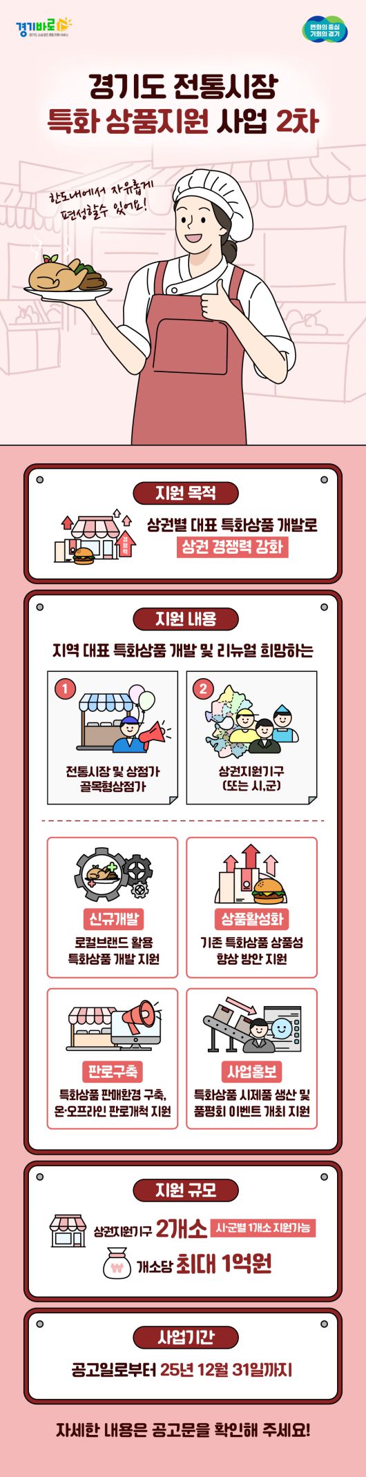 '2025년 경기도 전통시장 특화상품 지원 2차' 사업은 도내 전통시장과 상점가, 골목형 상점가를 대상으로 ▲신규 상품개발 ▲기존 상품 활성화 ▲판로 구축 ▲사업 홍보 등을 통해 대표 특화상품을 육성하고 상권 자립 유도 등을 지원하는 사업이다.